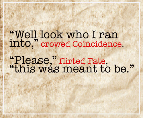 Coincidence-FateAn accident?  I am not so sure about the word accident.  An accident poses so many debatable thoughts concerning its reality.  Do you believe in coincidence?  I do.  And I don’t.  I prefer to think in terms of “natural order” . . . that I am following a natural order that is designed as a result of the deliberate and spontaneous choices that I make.   I do somewhat embrace the notion of fate or destiny; still, I do believe that we are all capable of steering our lives into states of “coincidence” that override all of the imaginings that we could and can concoct.